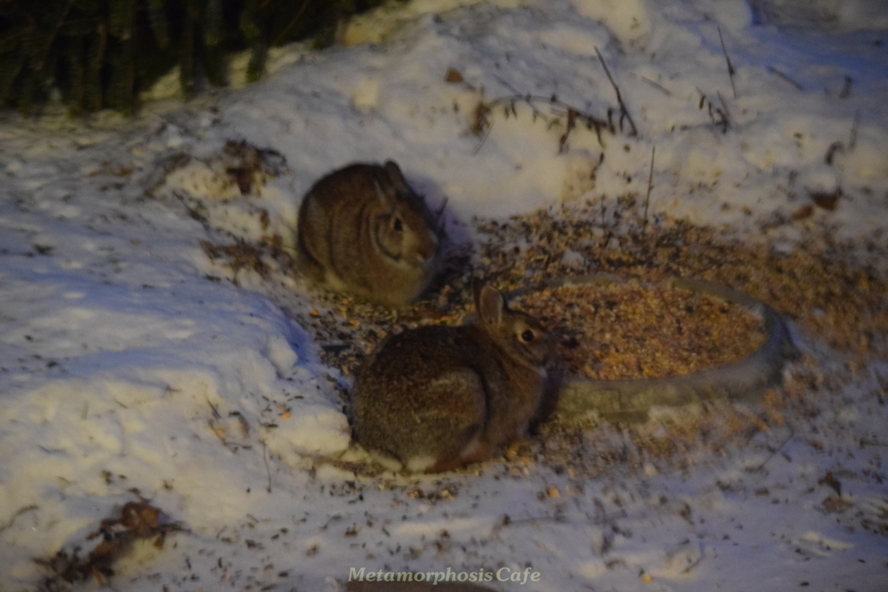 They hide under our porch and provide additional exercise for our Beagle, Scotty when they decide to chance a run out of there. We do pay for the entertainment in other ways than the food we buy. They nibble on my shrubs and cause me some frustration, but the cuteness outways the frustration for me. I try to plant enough garden in the summer to share with the wild critters and protect the more sensitive shrubs. This fall I left some kale in my garden after a freeze and they have stripped all of the leaves and outer coating off. Each person has to way the cost/benefit of feeding the wildlife. But for us the benefit far outweighs the cost. Enjoy the critters and see the joy in them! 🙂
