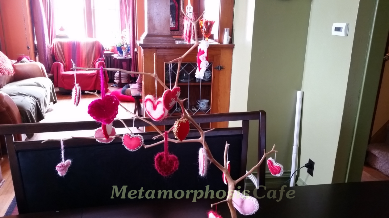 I think now that we really didn’t have much money at all, but it didn’t seem that way at all to us. She made super cute little cloth hearts to hang on a branch that she stuck in a glass jar. When she was downsizing to move to an apartment several years ago I was quick to lay claim to that branch and the valentine hearts.